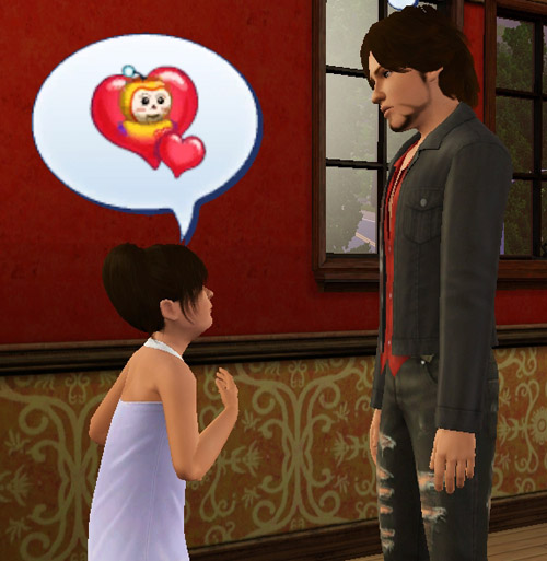 Then, right after Thierry became a teen, Amelia rolls a wish to have a first kiss with him. So I invite him over, and right after she invites him in, she has 'be smooched' in her queue, and, bam, he's all over her. Not even a shy first kiss deal, he completely went for it.